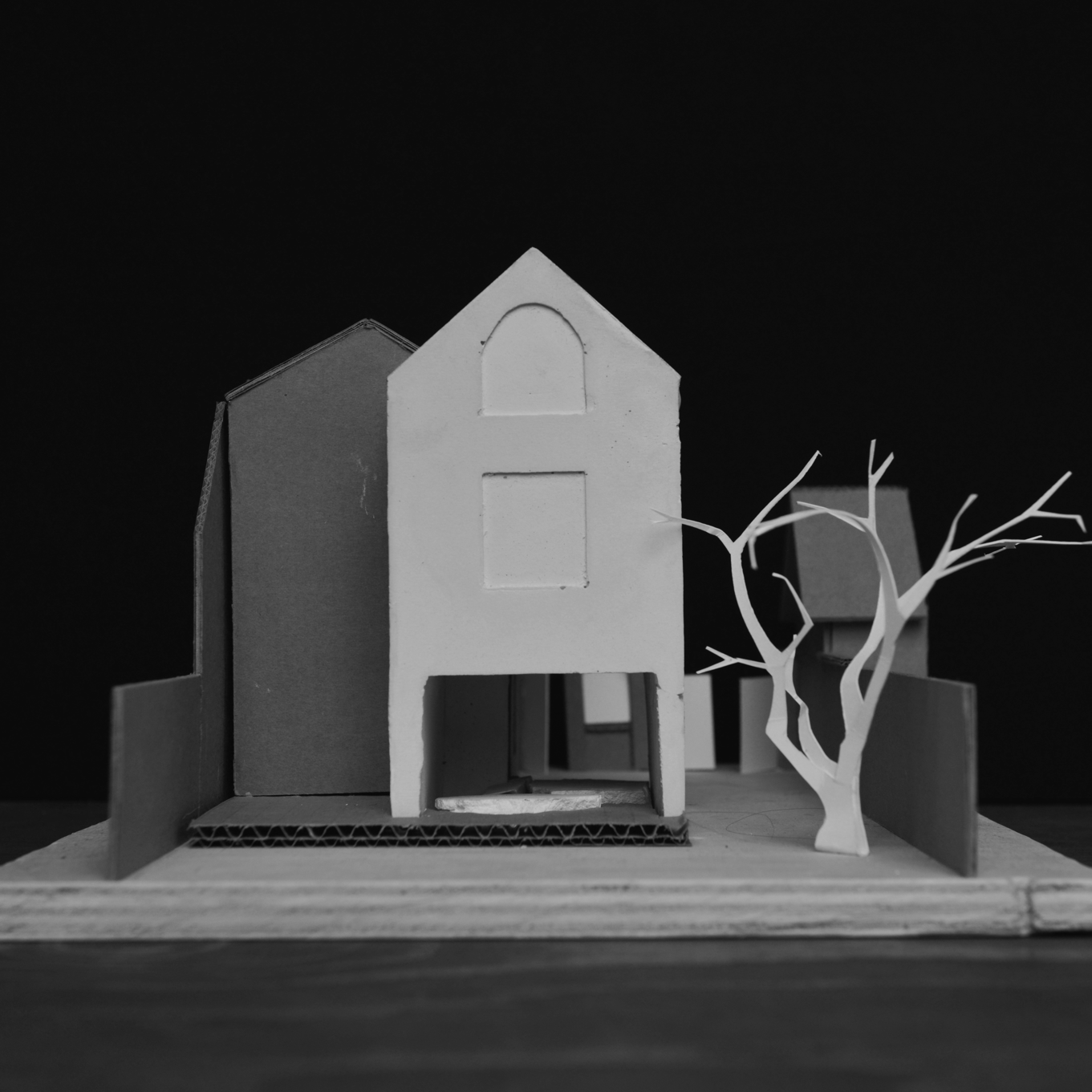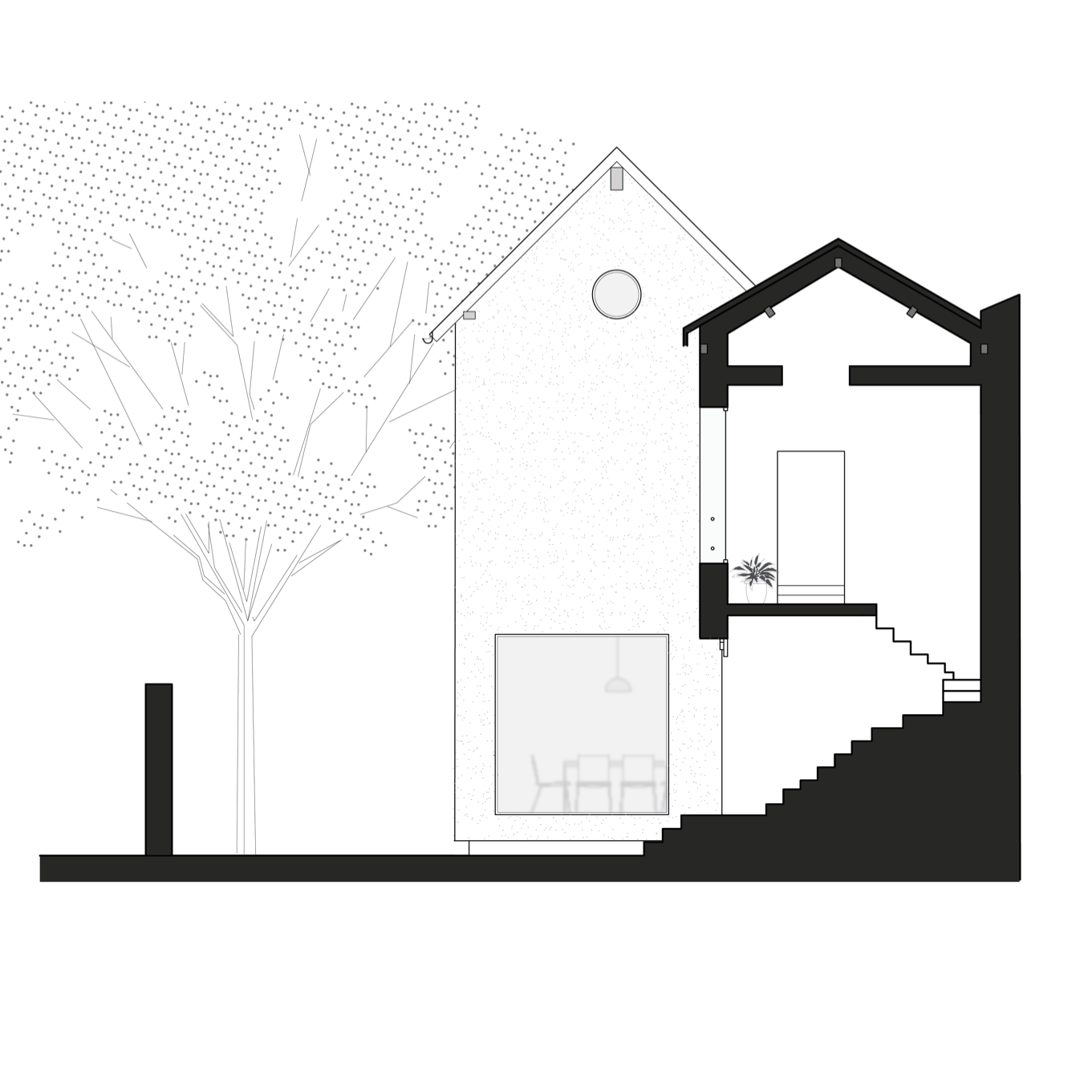 Au rez-de-chaussée, le salon est traversant entre l’entrée et le jardin. Au premier étage, la surélévation est aveugle, dessinant un fond qui met en valeur la maison du cocher, bien dessinée. Sous les combles, un oculus éclaire l’escalier et ouvre à l’imaginaire du toit.