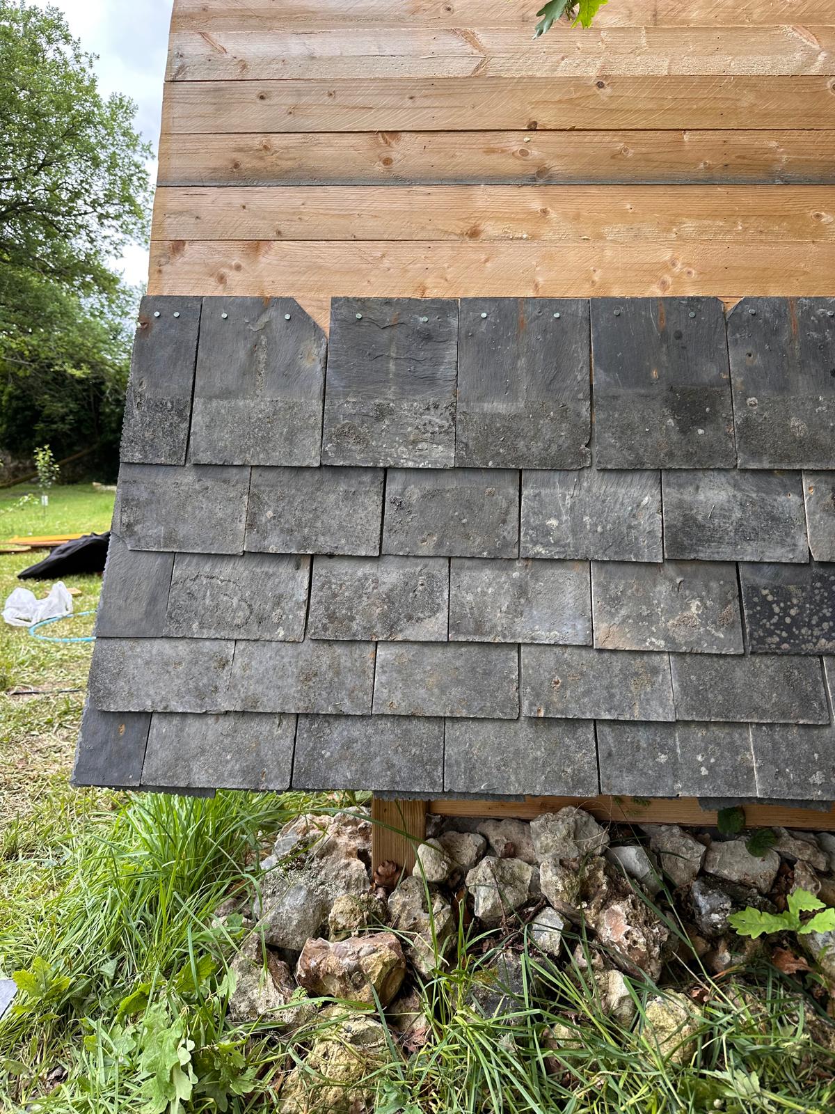 Sur le site, les ressources naturelles disponibles sont mises à profit : silex, bois et terre. Les silex sont utilisés pour stabiliser les fondations. Les structures des huttes sont réalisées en bois issu directement de la forêt environnante, dans une logique de proximité et d’intégration au paysage. La couverture est composée d’ardoises en réemploi. L’isolation est réalisée en torchis, un mélange traditionnel de terre et de fibres végétales.
